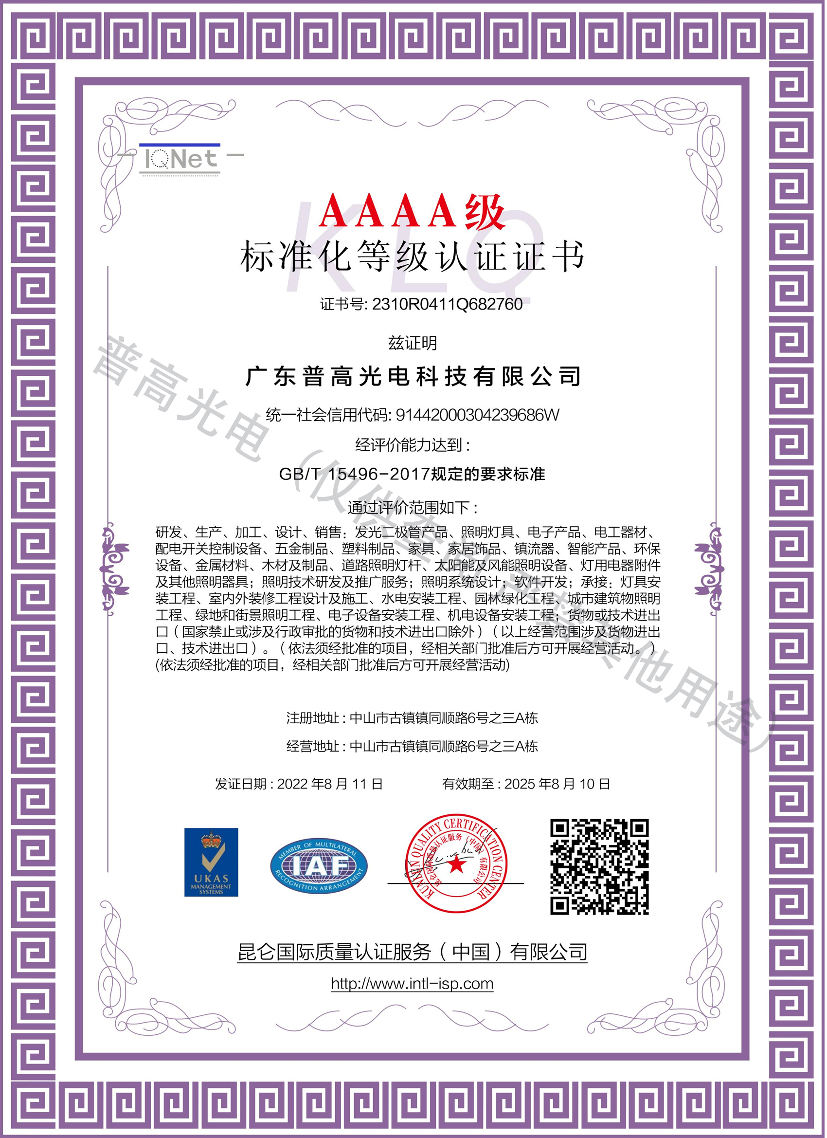 AAAA級(jí)標(biāo)準(zhǔn)化等級(jí)認(rèn)證證書(shū)